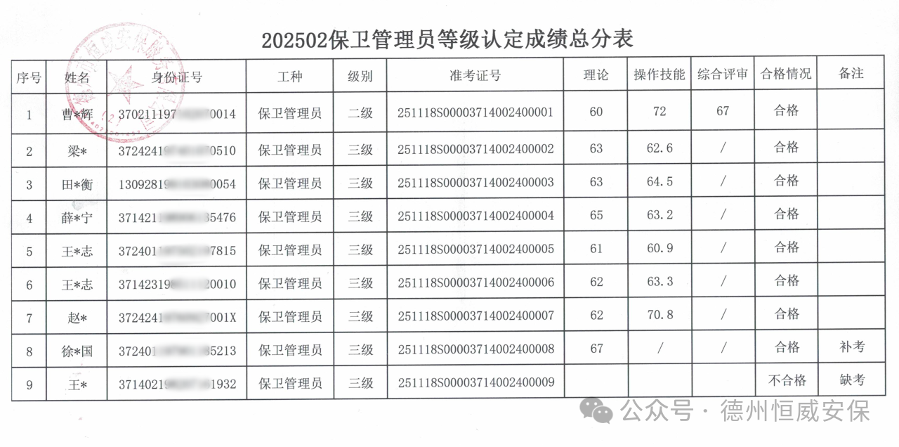 202502保衛(wèi)管理員職業(yè)技能等級(jí)認(rèn)定成績(jī)公示